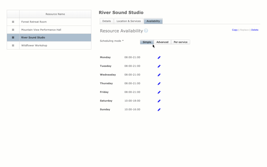Jezzam gives you full control over managing your resource booking. With a choice of simple, advanced and per-service scheduling, Jezzam allows you to define each resource's unique schedule.